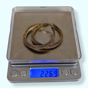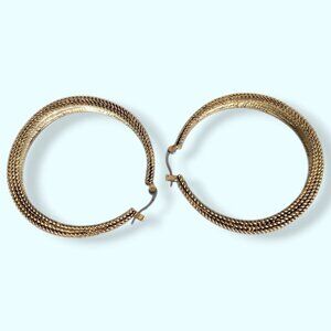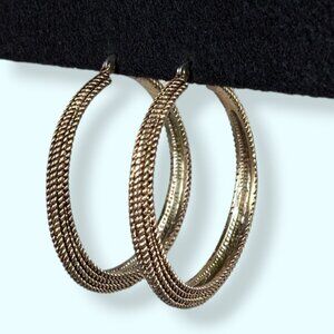 These vintage hoop earrings are made of a gold tone metal and have locking post findings. The hoops are narrow at the top and widen at the bottom. The interior is smooth while the exterior has a vertical rope detail all the way around. Though they still fit in the palm of my hand, these hoops are on the larger side of hoops we have listed. There is normal wear, including some tone darkening/unevenness, but no issues affecting wearability - please see the pictures.