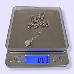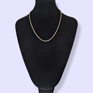 This vintage chain necklace by Liz Claiborne is made of a silver tone metal and has an adjustable lobster clasp closure with a maker's tag that is stamped LC on one side, and Liz Claiborne 1976 on the other. The necklace is a rope chain with rounded links that move smoothly, and it looks good by itself or as part of a stack. There is normal wear, including some superficial marks in the surface of the maker's tag, but no issues affecting wearability.