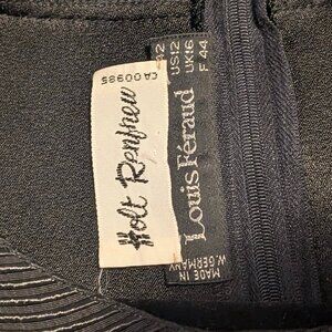 This vintage dress by Louis Féraud (sold through Holt Renfrew) is made of a black acetate/viscose blend (72/38). The dress is a shift style with a relaxed fit and has long sleeves with a line of detail at the cuff. The dress has a round neckline with a black sequin covered triangle on the chest that comes down from the neck. The dress has sewn-in shoulder pads and there are little pleat details at the edges of the shoulder (see pic 3). There is also a long zipper that runs down the center of the back. The hem of the dress falls well below the knee but above/around the ankles (give or take, depending on your height). Finally, there is a pocket on either side of the hip, which we love. The dress has normal wear but there are no stains or tears, and there are no missing sequins.