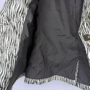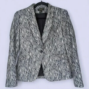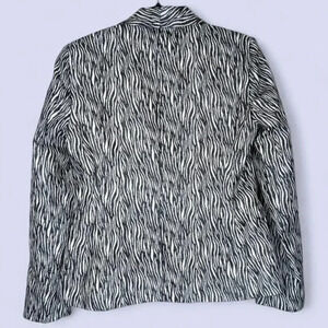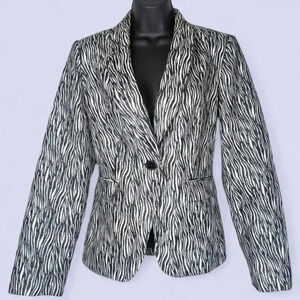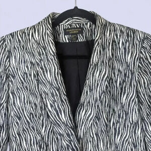 Wearing this awesome vintage blazer, made in Canada by Portfolio Louben, can make you feel like you're about to go on stage. Featuring a single front button closure, a lined black interior, and standard shoulder pads, this textured zebra print blazer is a rare beauty. The fabric has a very gentle metallic sheen to it that is visible to the eye but hard to capture, as well as a slightly raised texture.