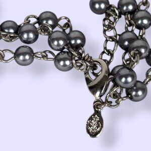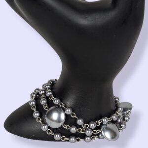 This vintage demi parure by Premier Designs includes a very long infinity necklace and a matching 3-strand bracelet. The necklace is a long chain dotted with small silver metallic beads, and accented periodically by larger, flat, round silver metallic disc beads. The necklace is tripled in the pictures and is probably too long to wear single, but doubled is probably the best option. There is no opening, it is infinite. The bracelet has 3 strands that have the same beads as the necklace: small round, and larger discs, all silver metallic. The bracelet has a lobster clasp closure and a maker's tag stamped with the Premier Designs' mark. There is normal wear, but the pair is in good condition and there are no issues affecting wearability.