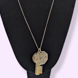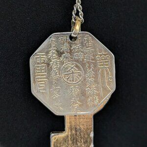This vintage necklace has a chain made of a silver tone metal with a c clasp closure. The necklace has 2 pendants, which I don't think originally came together. The first looks like a key, and from what I was able to find, might be called a "Tarot of Bohemians" and features what may be elemental signs or some kind of glyphs. The octagonal pendant appears to be a "Feng Shui Tai Shang Lao Jun" pendant coin, though that is about all I can tell you specifically. Both are made of gold tone metal and have tone loss throughout.