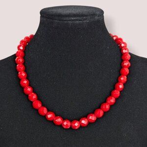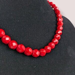 This vintage necklace is beaded and has an adjustable hook closure. The beads are spherical, faceted, uniform in size, and made of red glass. Each end of the necklace has a gold tone filigree "cap" made of several different pieces. There appears to be a little extra space on the string, like maybe a single bead broke at some point, but this is hidden by the "caps". The necklace has general wear and there may be some tone change to the metal, but it is in good condition and has a lot of life left.