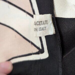This vintage scarf is a large square made of satin acetate with machine stitched edges and was made in Italy. The scarf has a black border all the way around with black lines running diagonally through the center. The shapes created by the diagonal lines are filled in in white, beige, red, orange, and black. There is normal vintage wear in the form of some small pulls and small pull holes (see last image, scarf held up to light). Still, the scarf is very wearable and has lots of life left.