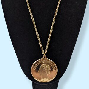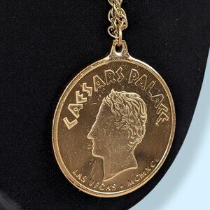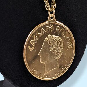 This vintage necklace is made of a gold tone rope chain with a c clasp closure. The pendant hanging down is a large, heavy gold tone medallion that says, "CAESARS PALACE, LAS VEGAS, MCMXCI" on both sides (MCMXCI being 1991). There is normal wear throughout, including some superficial marks in the surface of the medallion metal. The medallion is like the Flavor Flav clock pendant of the coin world.