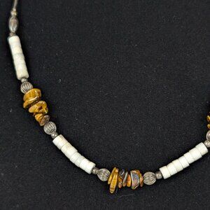 This vintage necklace is made of a silver tone metal and has a barrel clasp closure. The necklace is strung with several types of beads: round white shell beads, small spherical silver metal beads, and chips of brown and orange tiger's eye stone. There are also silver metal cylindrical beads towards the back of the necklace, often called "liquid silver". The necklace has normal wear, including a darkening patina in the tone of the metal, but no issues affecting wearability.