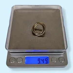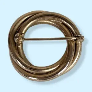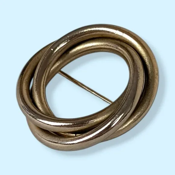 This vintage brooch is made of a gold tone metal and has a modern locking c pin closure. The brooch is small and is made up of 3 metal circles with their centers cut out, all twisting together. The brooch has normal wear, including some increased shininess in the surface of the metal (as opposed to what seems to be a matte finish).