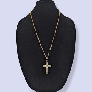 This vintage necklace is made of a gold tone metal and has a long continuous chain without an opening. The pendant is attached by a jump ring in its top and is shaped like a cross, designed in a damascene style. The cross is stamped SPAIN in the center of the back. There is normal wear throughout and it appears that the chain is not original, but there are no issues affecting wearability.