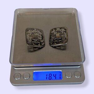 These vintage earrings are made of a silver tone metal and have clip on backings with small rubber pads in them. The earrings are square with a somewhat rounded front. The interior of the square features an intricate linear cut-out pattern that I haven't been able to find anywhere else. One of the earrings is slightly more polished than the other, but the difference isn't very big. There is normal wear throughout, including darkening in the back metal tone.