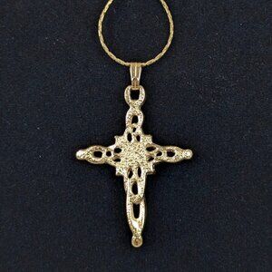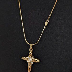 This vintage necklace is made of a gold tone metal and has an old style lobster clasp closure. The chain is thin, flat, and sturdy, if a bit dainty. The pendant is shaped like a cross and has a bail attached to its top. The ends of the cross are tapered and it has a swirly cut-out design. The very center has a white/clear rhinestone with 4 smaller rhinestones accenting it. There is normal wear, including some tone darkening in the metal, but no issues affecting wearability.