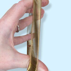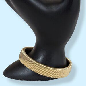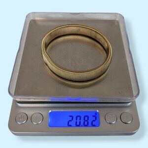 This vintage bracelet is made of a gold tone metal and stretches rather than having an opening. The bracelet has a fairly solid appearance, but is actually a very tightly coiled strand that has a big stretch and snaps back to shape well. There is a small circle on the interior (see pic 4) but I'm not sure what might have been there. I've seen band bracelets like this before that were sleeve guards accented by faux pearls, but this piece doesn't have a partner (or faux pearls). It could, however, still be used to guard one sleeve, if you like. There is normal wear, most visible as tone darkening in the metal.