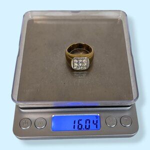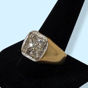 This vintage ring by Uncas is made of a silver tone base metal with an 18k yellow heavy gold electroplate (HGE - heavy gold electroplate). The ring is stamped "18KT HGE U" inside the band with the "U" being the Uncas logo with the arrow (see pic 6). The ring itself is quite chunky with a nice weight to it. There are 9 white/clear rhinestones sitting in the rounded square face and the backs are open (see pic 5). Pic 4 shows the front of the ring with unadjusted brightness - the other pictures were darkened a little to show the details better. There is normal wear throughout, including tone darkening in the metal (fading of gold electroplate) and some yellowing around the rhinestones.