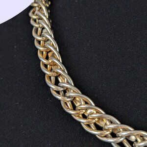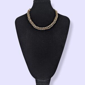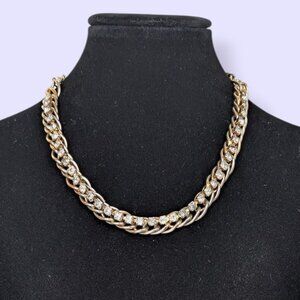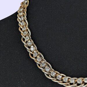 This vintage necklace is made of a gold tone metal and has a (replacement) lobster clasp closure. The necklace has a thick chain at the front with a long row of small white rhinestones across it. The necklace has wear throughout, including tone loss in the metal, an uneven back chain, and a loss of shine in some of the rhinestones. I'm listing the piece regardless because I think it's special and has a lot of life left, and I hope someone loves it.