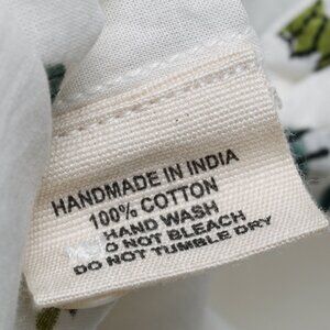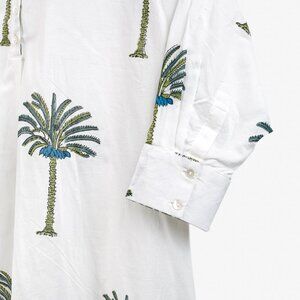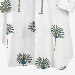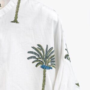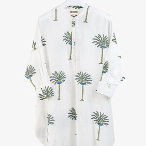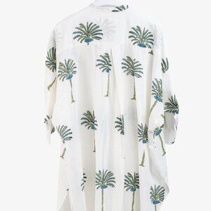 This tunic in the "Green" colourway from V de Vinster is crafted in a lightweight white airy cotton, and is printed all over with Green and blue palm trees. It features long dolman sleeves with buttoned cuffs, drop shoulders, a crew neckline, button front closures on the henley, a relaxed and oversized fit, and a rounded hem.