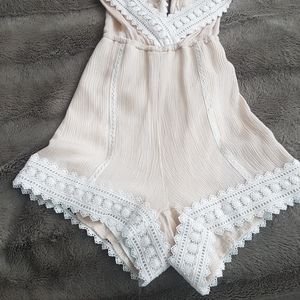 Cream and white romper with back strings that tie at the back.