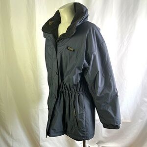 Valanga Blue Winter Coat with Hoodie | Vintage | Faux Sherpa | Women's Size 12 | Gold Embroidered Valanga Signature | Hidden Hoodie | Adjustable Waist | Made in Canada