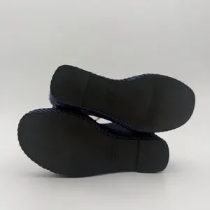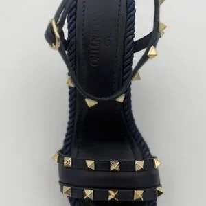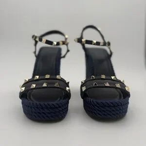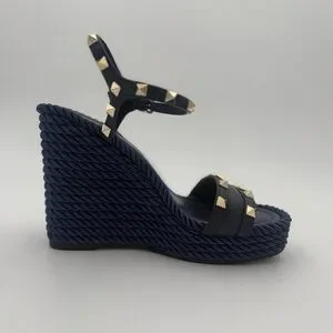 Iconic Valentino Garavani wedge sandals featuring the house’s signature Rockstud detailing. Designed with smooth navy leather straps adorned with gold-tone pyramid studs and an adjustable ankle strap with buckle closure. The sculptural wedge heel is wrapped in a textured rope-effect fabric, offering both statement style and comfort.