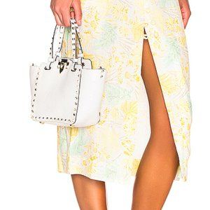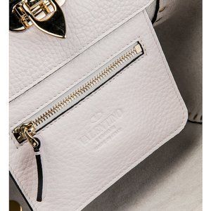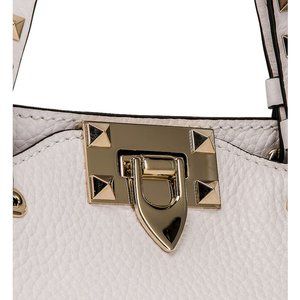 Grained leather with raw lining and pale gold-tone hardware. Made in Italy. Measures approx 11"W x 7"H x 3.5"D. Handles measure approx 13" in length with a 4.5" drop. Detachable shoulder strap measures approx 46" in length. Flap hook top closure. Interior zip pocket. Pyramid stud embellished. Style No. VENT-WY396. Manufacturer Style No. RW0B0861VSF.