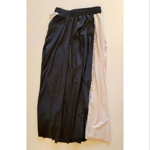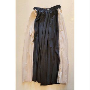 Valentino accordion pleated black skirt with white panels on the sides, decorated with lace. The skirt has an elastic waistband with a contrasting white drawstring.