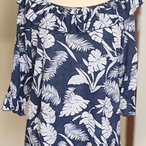 VAMP, Off-Shoulder Top, Navy & White, Palm Leaves, 3/4 sleeves, Ruffle, Large