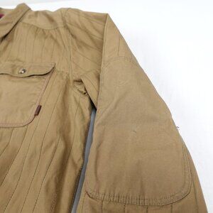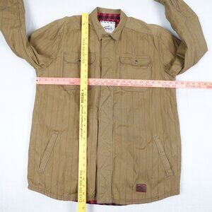 Hybrid shirt jacket introduced in 2013. Beautiful quality quilted 100% cotton outer with 100% cotton plaid lining, elbow patches and antique brass snaps. Excellent condition, one tiny faint mark on one elbow patch, barely noticeable, otherwise no stains, no rips or holes, very little wear. Tag size XL - see measurements in photos.