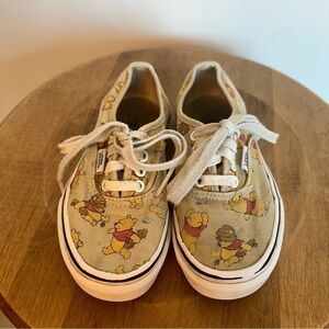 VANS kids sneakers with Winnie the Pooh pattern on them. Lace up sneakers. They do have some wear, as shown in the attached photos. Wear includes some scruff marks, discolouration, one of the shoe lace ends has come undone and logo wear on the heel of the shoe.
