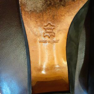 This shoe is made of a fine, deep olive suede that shows some scratching at the front - see pics - that due to the deep colour of the material is not noticeable when wearing but only upon inspection. I have photographed the scratches in a way that enhances them so that it would pick up on the photo.