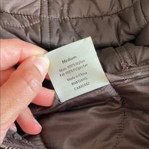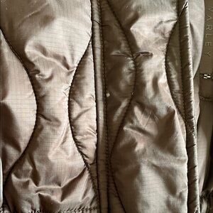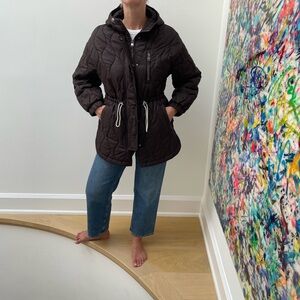 Keep warm and stylish with this quilted hooded jacket from Varley. Perfect for chilly days, this Coffee Bean brown jacket offers comfort and durability. Size Medium. Slight discolouration spit on front.