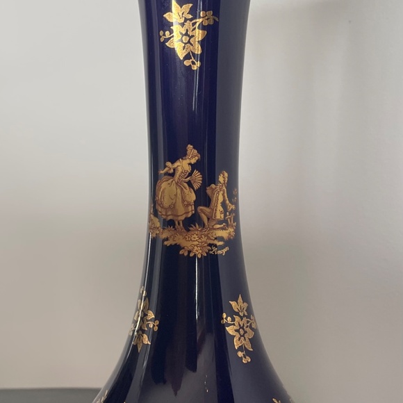 This exquisite Limoges vase is crafted from fine French porcelain and features stunning blue tones, adorned with intricate 22K gold leaf details. Standing 8.5 inches tall (22 cm) with a 1.75-inch opening (4 cm) and a bottom diameter of 3.5 inches (9 cm), this vase is a perfect piece for any collection or to elevate your home decor.