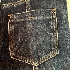 Dark wash utility jeans with large applied pockets with flaps on the legs. High rise, wide legs.