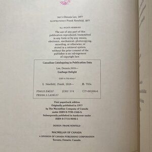 "Garbage Delight" is a children's poetry book by Dennis Lee with illustrations by Frank Newfield, and a classic piece of Canadian literature. Originally published in 1977, this vintage hardcover edition features a collection of fun and whimsical poems. The playful language and detailed illustrations make this a great book to inspire a child's interest in poetry, literature and language.