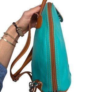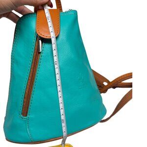 Chic and compact VERA PELLE Italian genuine leather mini backpack in a gorgeous mint green with tan brown accents. Perfect for everyday wear, travel, festivals, or hands-free errands.