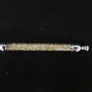Matching spoon and fork salad server set with clear handles with shiny light yellow crystals inside.