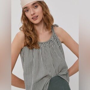 White with dark green stripes, flowy relaxed fit with cute tie straps.