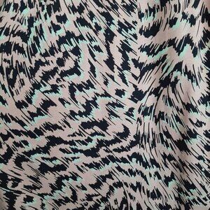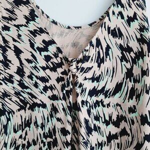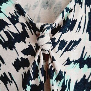 • Sleeveless pull over comfy and stretchy scoop neck dress in cream, black and green abstract print with back knot detail.