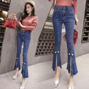 Flare Jeans with front slit and pearl detail