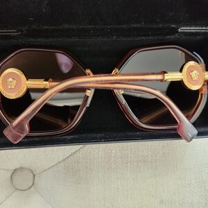 Oversized irregular Octagonal shaped Translucent 'Havana' Pink Designer Sunglasses with Wide Brown Gradient Lenses, by Versace.