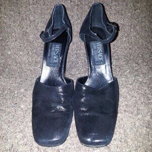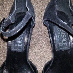 These are gorgeous. Authentic VERSACE COUTURE heels in a metallic black suede...slightly shiny/glittery.