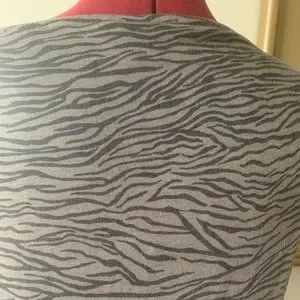 This is technically a maternity dress but I’ve worn it often post pregnancy. It’s extremely versatile as it can be worn on its own or with jeans or leggings. I’ve used it as a beach cover up as well. It has a draped neckline and features a grey on grey zebra style print. GUC