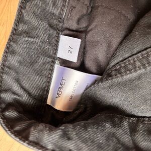 Stylish distressed black cropped, wider leg pant with ripped knees. 100% cotton, size 27.
