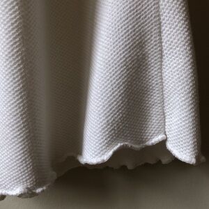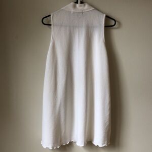 White cotton textured knit open front sleeveless cardigan. Lettuce hem. Nice layering piece. Can be worn open or belted