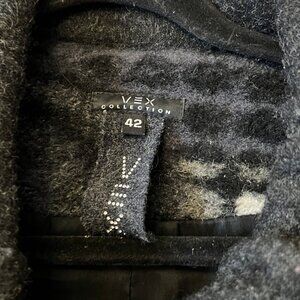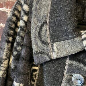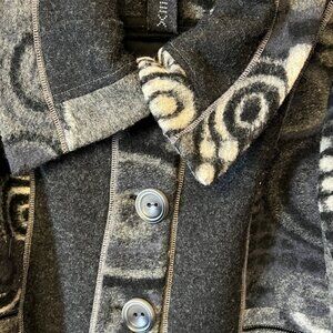 This stunning VEX Collection jacket is a true statement piece. Featuring a unique, artsy geometric swirl pattern in shades of charcoal, grey, and cream, it combines a cozy texture with high-end editorial style. The oversized collar and contrast stitching give it a modern, architectural fee