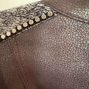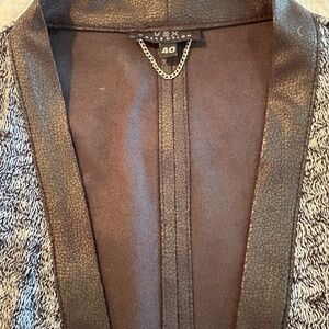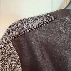 Trendy cardigan with black pleather back and details. Studded shoulder details too. Beautiful stitching. Perfect over a little black dress, black leather pants or even denim jeans! EUR 40/US 10