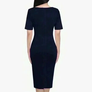 • Style: Pull-on, half back concealed zipper closure, colorblock white piping waistline which creates a slimming effect, Notch V Neckline, back slit for easy walking, Midi length, short sleeves, very stretchy