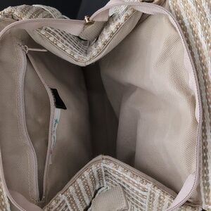 Vintage Italian made women's straw woven, zippered handbag with rope handles and metal accents.