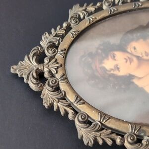 Vintage ornate metal oval frame features a Madam Lebrun with her daughter print.