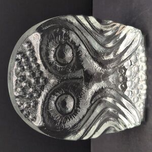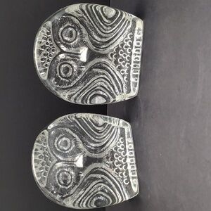 Vintage clear art glass Pilgrim owl heavy bookends from the mid-century modern era.