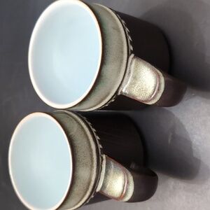 Vintage Denby Rondo set of 2 rustic, ceramic tea cups made of stoneware with a dark brown base and a mottled green rim.
