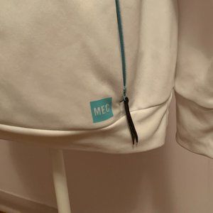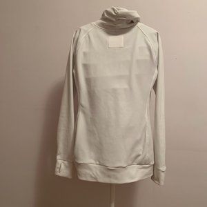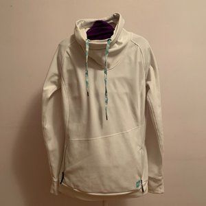 Cowl neck sweater in white with turquoise blue accents. Two front pockets.