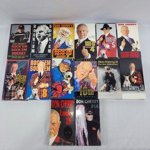 Lot of 14 Don Cherry NHL videos including Rock 'Em Sock 'Em 1-9, Don Cherry 10-14 (same series they just removed the Rock Em Sock Em from the title). Tapes in great shape sleeves have some wear as shown. I forgot to include #14 in the group photo, but it is included.